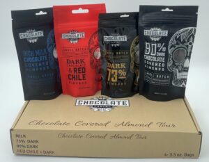 Experience four different chocolate covered almonds. The tour features roasted, caramelized almonds covered in milk, dark, extra dark and the famous New Mexico Red Chile & dark. Something for everyone!